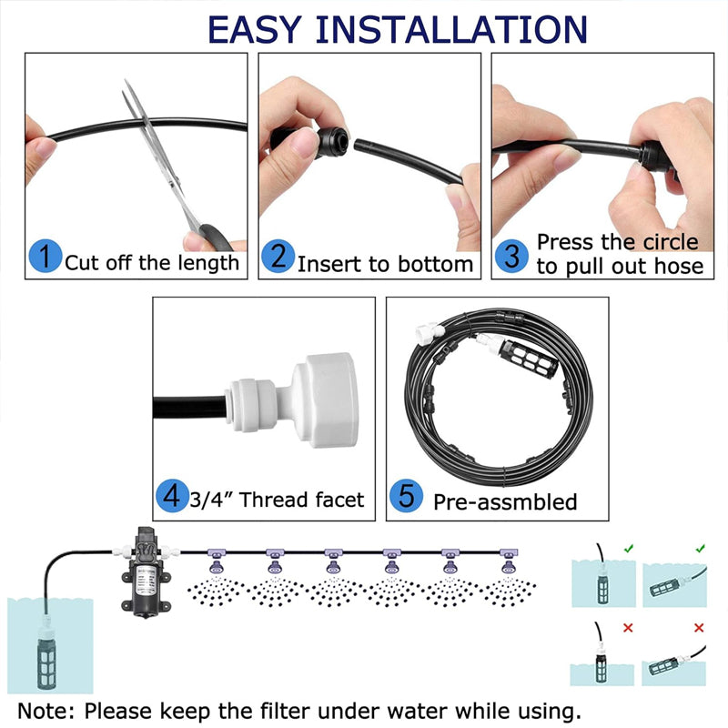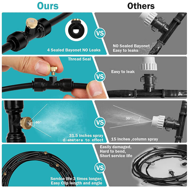 Flexible and uv-resistant pu tubing, brass misting nozzles, all these premium composition accessories are used to make the misting cooling system, and no leaking, no blocking, no rusting and long life use.